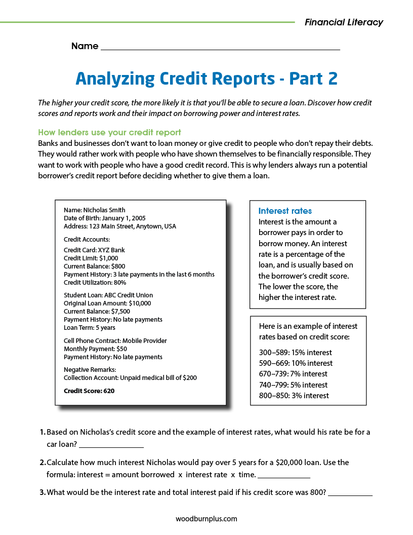 Students learn how lenders use an individual's credit report to determine interest rates on loans.