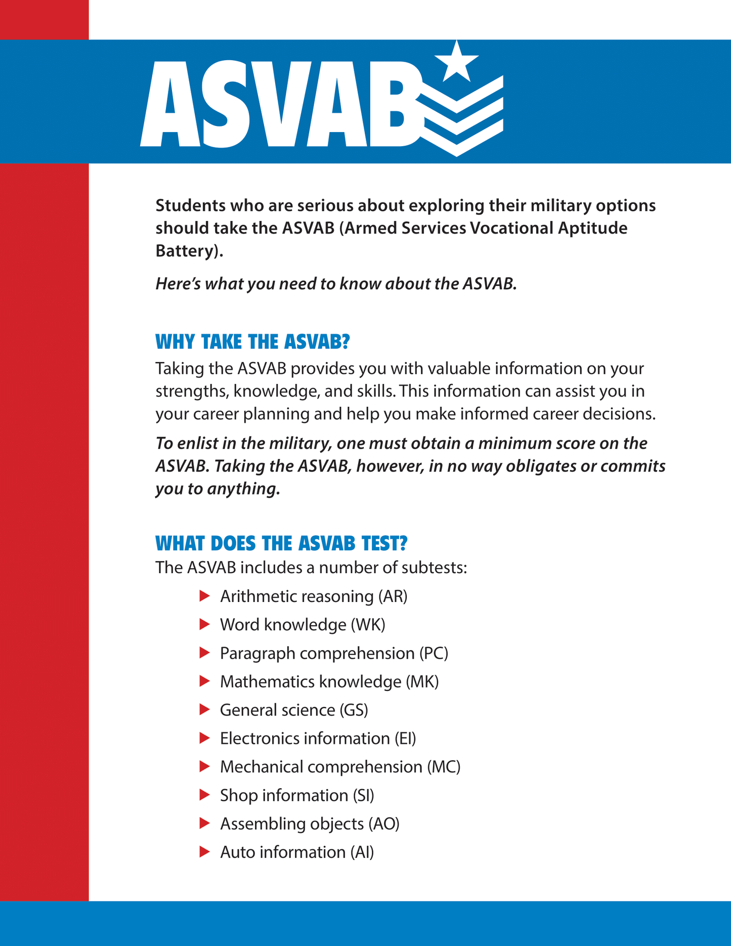 This InfoSheet contains information on the Armed Services Vocational Aptitude Battery (ASVAB) test for students interested in entering the military.