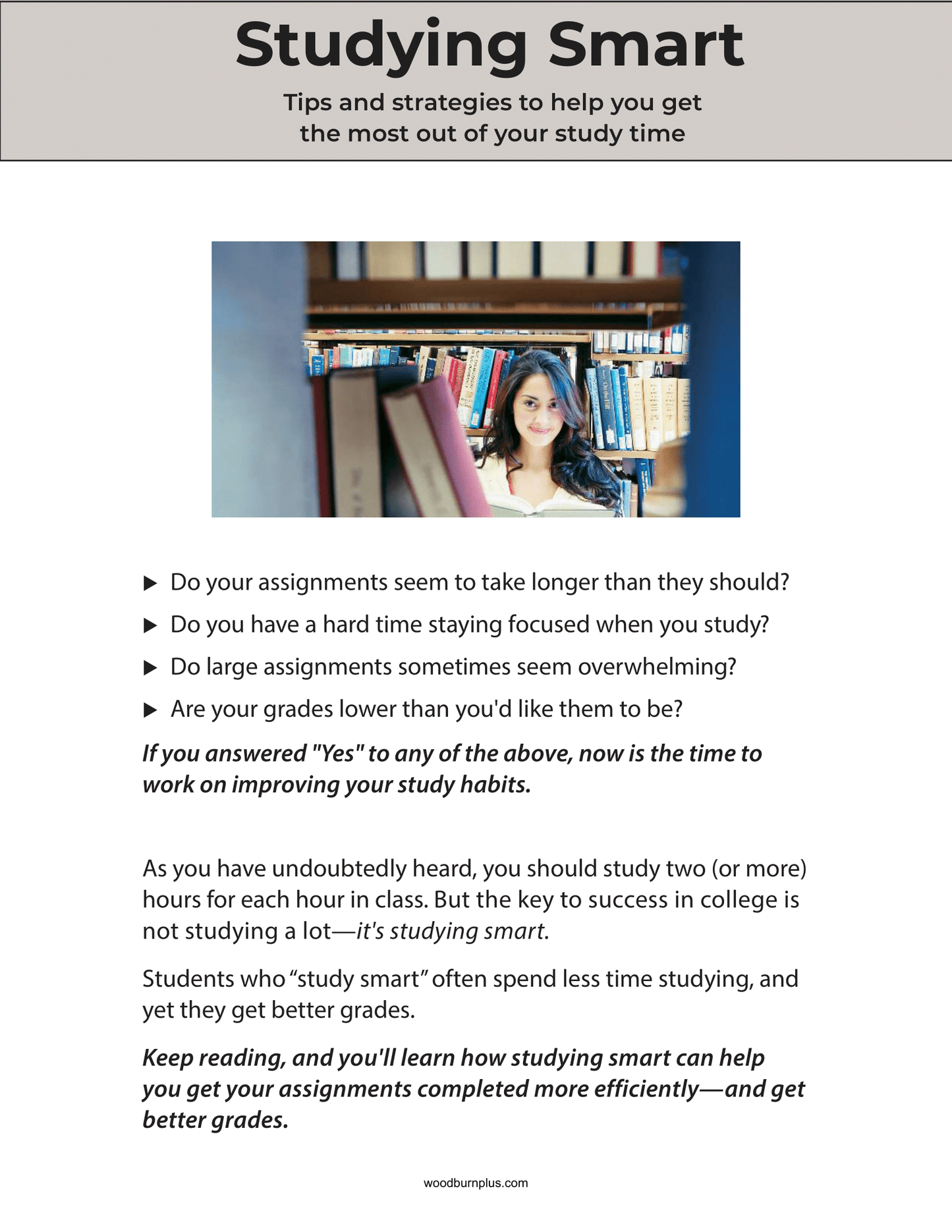 Equip your students with the tools they need to study smart. This InfoSheet is filled with tips and strategies to help students make the most of their study time, including where and when to study, how to organize study time, and how to get the most out of studying.