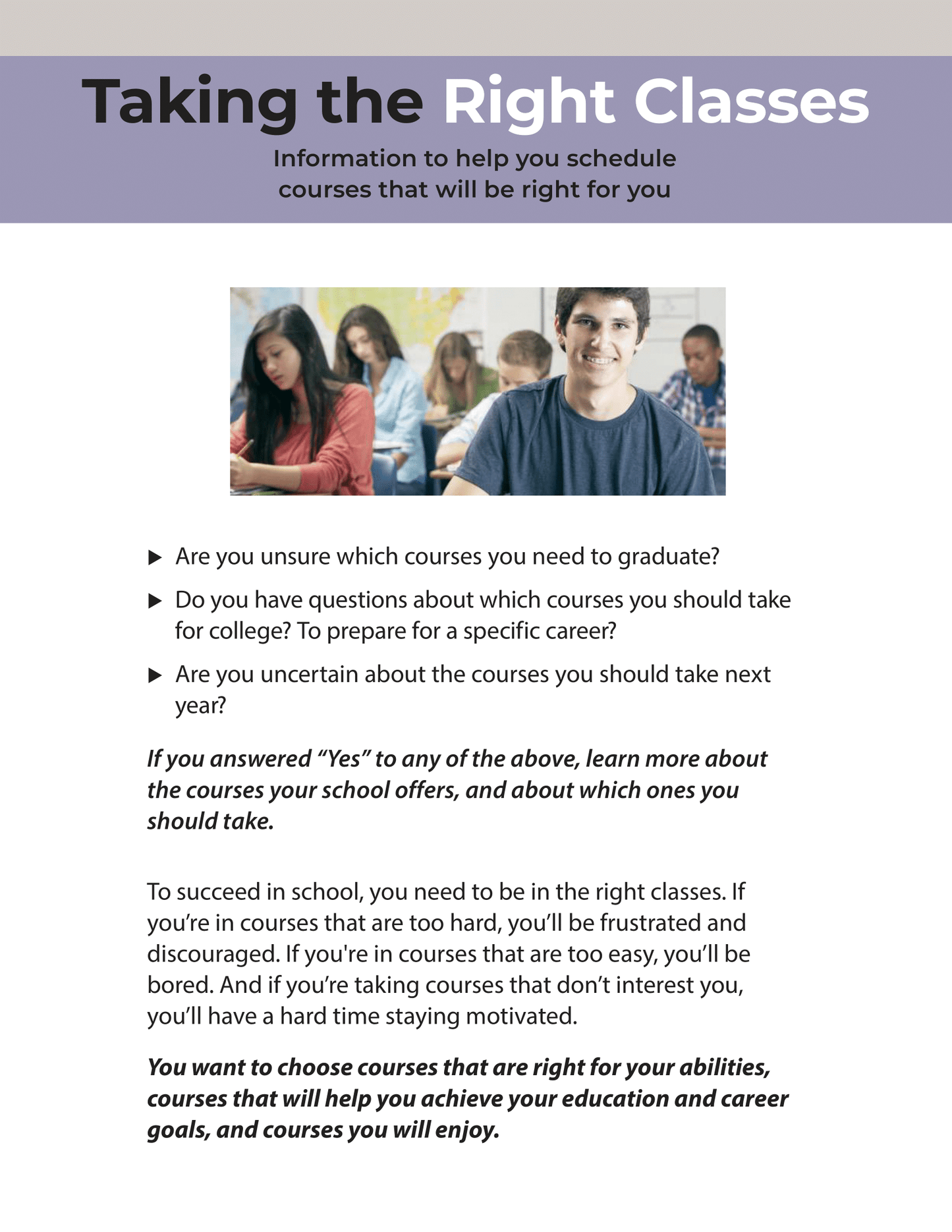 Make academic planning simple and easy to understand for your students. This valuable resource gives students important tips and strategies on how to choose the classes that will be right for them. It encourages student to consider graduation requirements, recommended college prep courses, NCAA requirements, elective options, and much more.