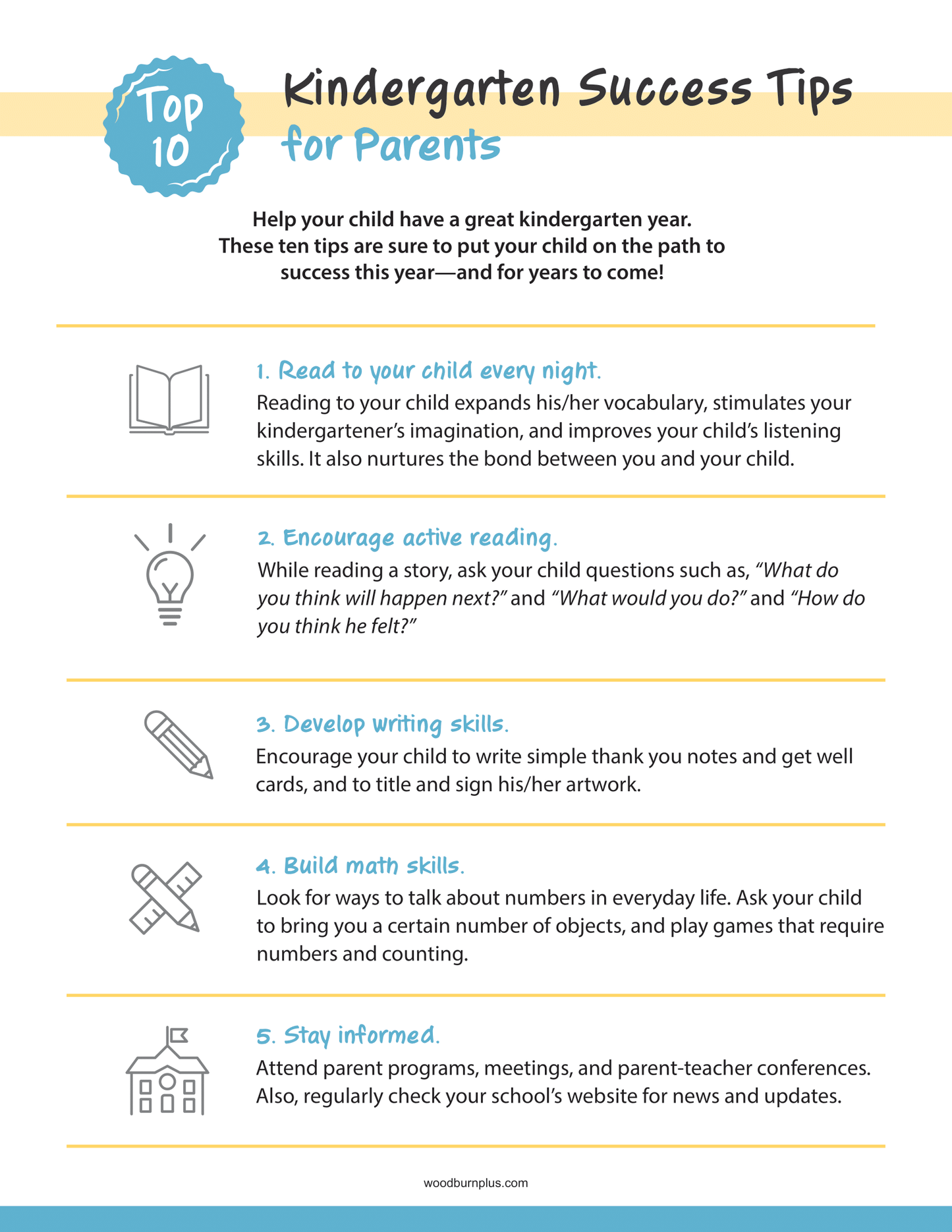 Give your parents tips to help their children succeed in kindergarten—and beyond! Providing ten simple tips to help kindergarteners succeed academically and socially, this resource is an excellent handout for all kindergarten parents.