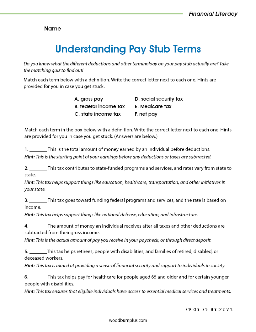 Students match common paycheck terms with their definitions.