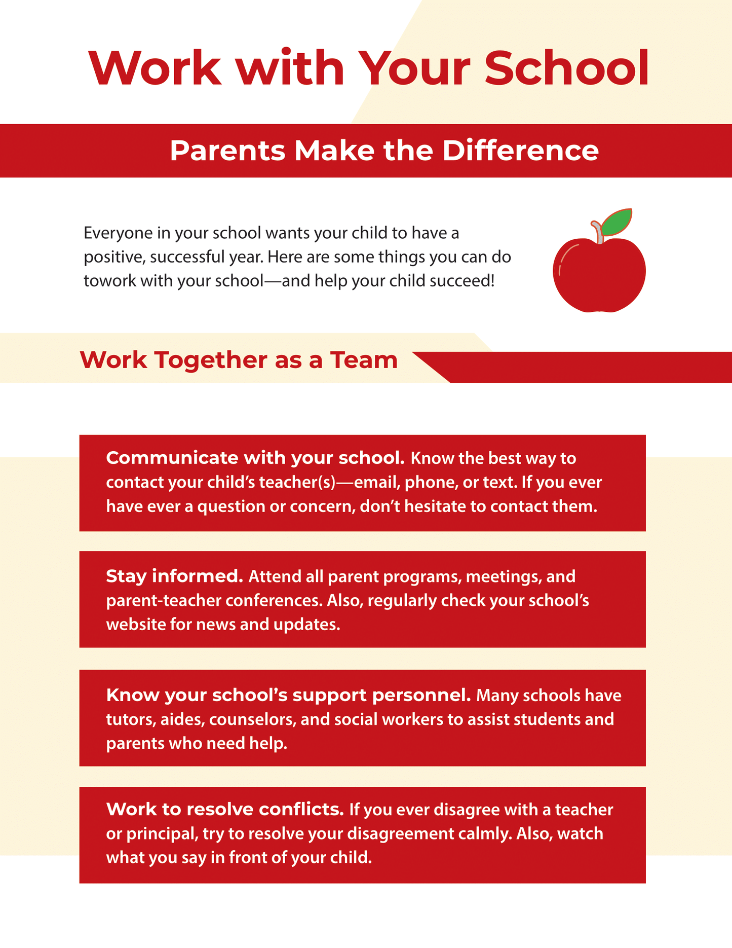 When parents work with their child’s school, everyone benefits! From making the most of parent-teacher conferences to participating in parent groups, this helpful InfoSheet provides multiple ways that parents can work with their child’s school and help their student succeed.
